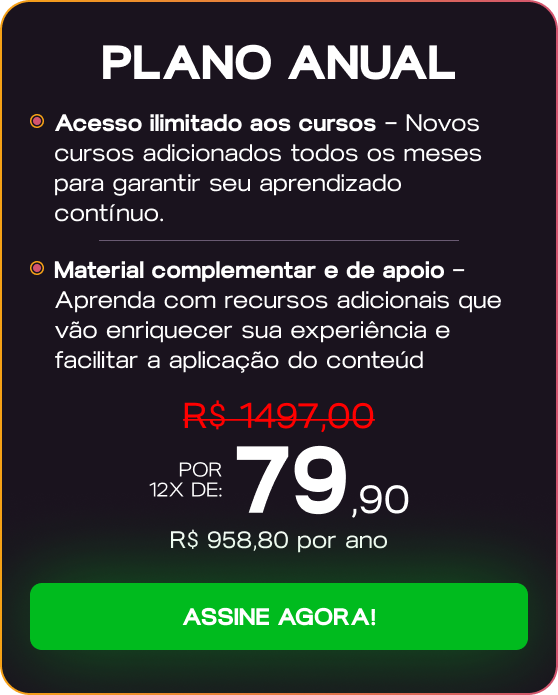 Você perde a chance de receber um curso novo todo mês, sempre atualizado com temas relevantes para o seu desenvolvimento.