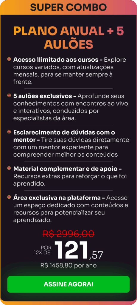Sim! Todo mês, você recebe um novo curso exclusivo, além de novos aulões, ferramentas e mentorias ao vivo no Plano Completo.